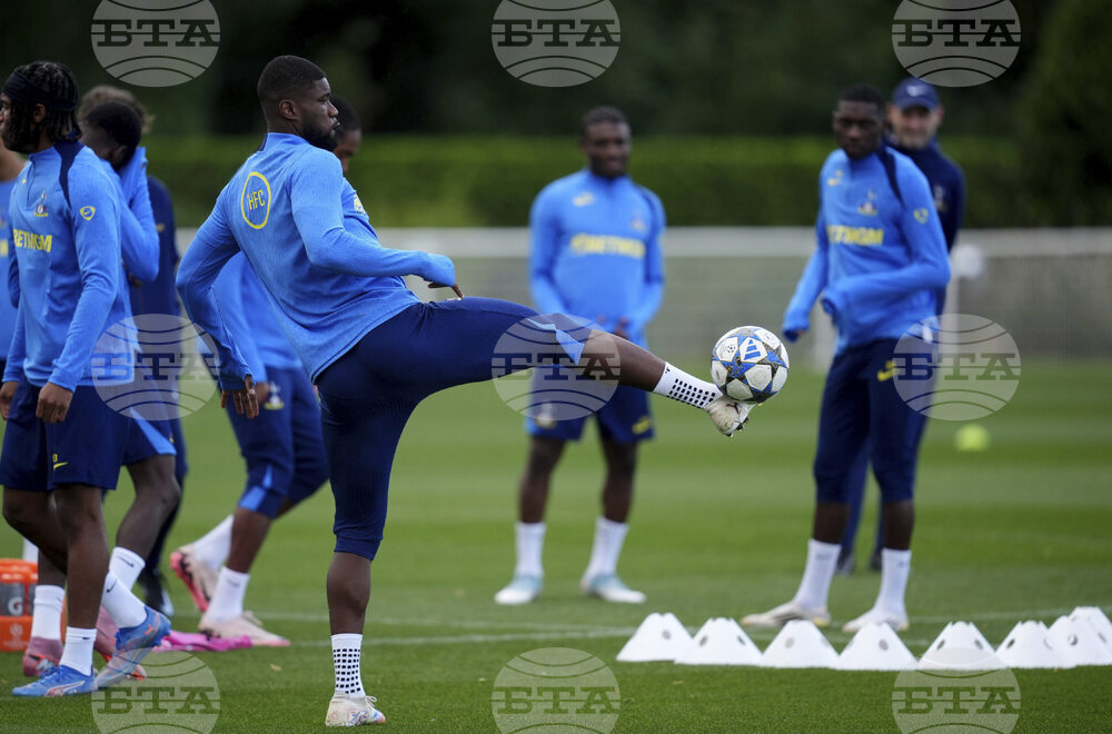Tottenham Hotspur's Kevin Danso, front, plays the ball during a training session in London, England, Monday Sept. 15, 2025, ahead of the Champions League soccer match against Villarreal. (John Walton/PA via AP)