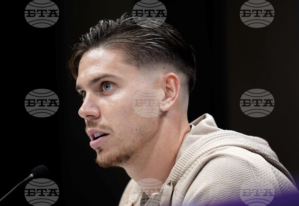 Tottenham Hotspur manager Thomas Frank attends a press conference in London, England, Monday Sept. 15, 2025, ahead of the Champions League soccer match against Villarreal. (John Walton/PA via AP)