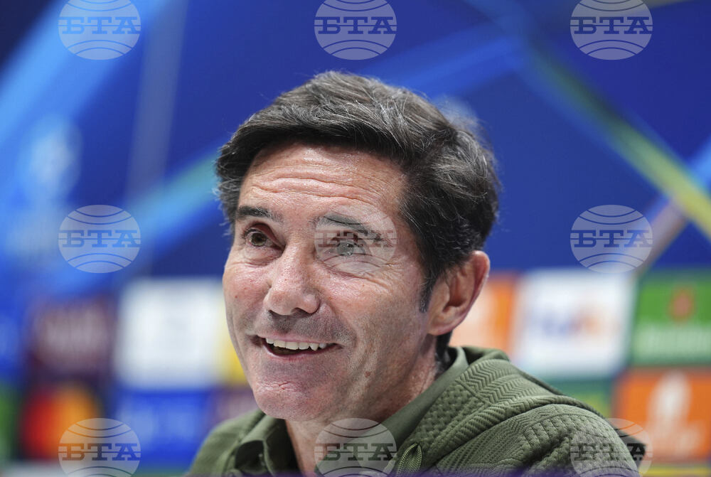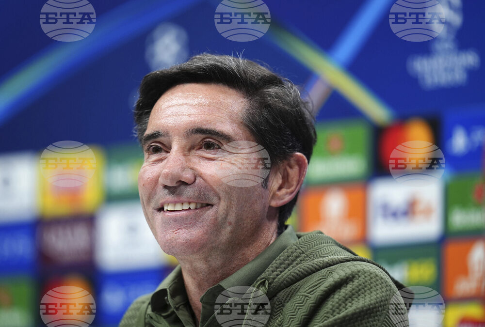 Villarreal's head coach Marcelino attends a press conference at the Tottenham Hotspur Stadium in London, England, Monday Sept. 15, 2025, ahead of the Champions League soccer match against Tottenham. (John Walton/PA via AP)