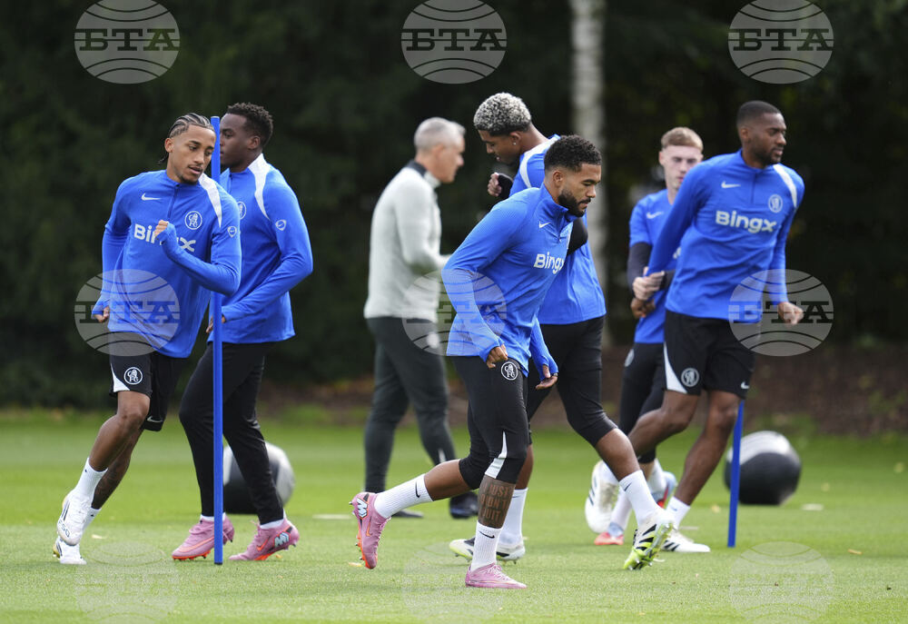 Chelsea's Reece James, front center, during a training session in London, England, Tuesday, Sept. 16, 2025, ahead of the Champions League soccer match against FC Bayern Munich. (Adam Davy/PA via AP)