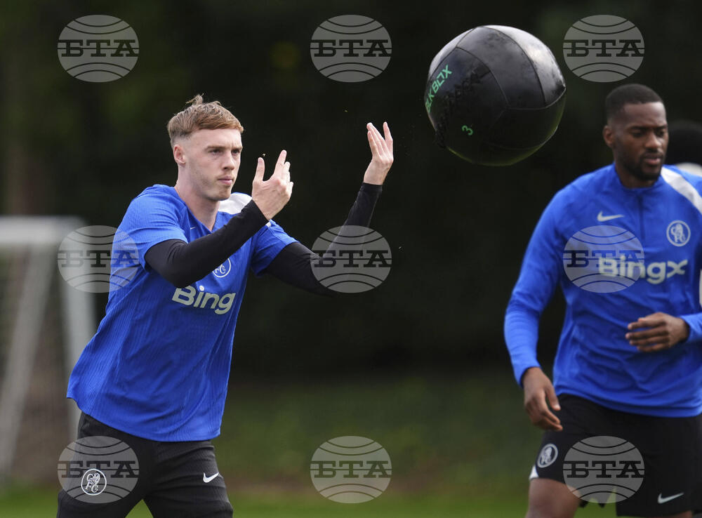 Chelsea's Cole Palmer, left, during a training session in London, England, Tuesday, Sept. 16, 2025, ahead of the Champions League soccer match against FC Bayern Munich. (Adam Davy/PA via AP)