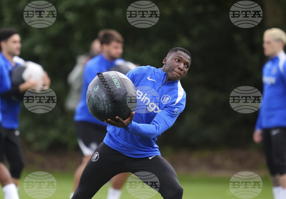 Chelsea's Moises Caicedo during a training session in London, England, Tuesday, Sept. 16, 2025, ahead of the Champions League soccer match against FC Bayern Munich. (Adam Davy/PA via AP)
