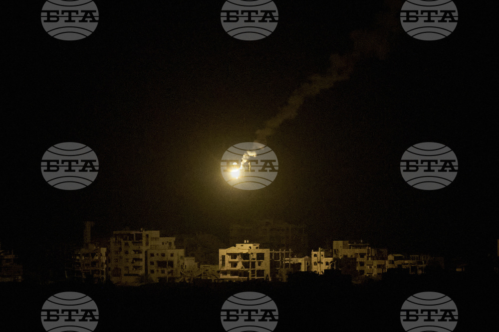 An Israeli army flare drifts over buildings destroyed during the Israeli ground and air operations in the northern Gaza Strip, as seen from southern Israel, Monday, Sept. 15, 2025. (AP Photo/Leo Correa)