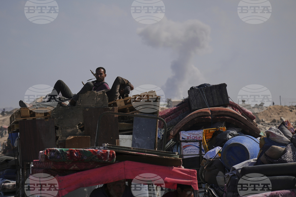Smoke rises in the background following Israeli bombardment as displaced Palestinians flee northern Gaza, Tuesday, Sept. 16, 2025, after Israel's military says its expanded operation in Gaza City has begun and warns residents to leave. (AP Photo/Abdel Kareem Hana)