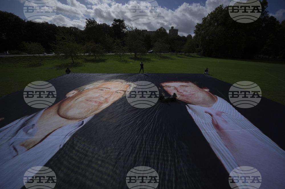 Activist from the protest group Everyone Hates Elon put up a poster of President Donald Trump and Jeffrey Epstein, ahead of the state visit by U.S. President Donald Trump, in Windsor, England, Monday, Sept. 15, 2025. (AP Photo/Kin Cheung)