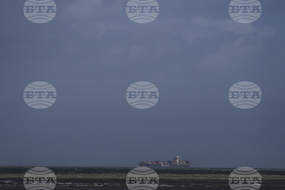 A container ship sails in rough waters during a wind advisory off the coast at Heist, Belgium, Monday, Sept. 15, 2025. (AP Photo/Virginia Mayo)