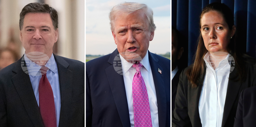 FILE - This photo combination shows, from left, former FBI Director James Comey in Washington, Dec. 7, 2018, President Donald Trump at Morristown Airport, Sept. 14, 2025, in Morristown, N.J., and Assistant U.S. Attorney Maurene Comey in New York, July 8, 2019. (AP Photo/J. Scott Applewhite, Alex Brandon, Richard Drew)