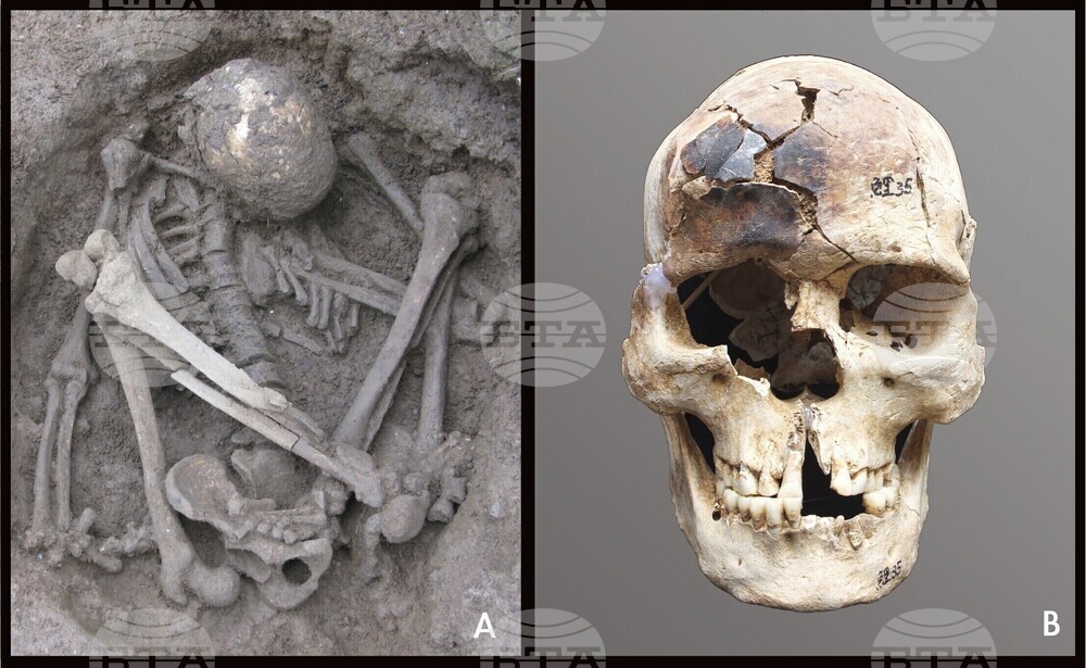 This undated combination photo provided by Hirofumi Matsumura shows a crouched mummy in Guangxi, China, with burn marks on its skull. (Li Zhen and Hirofumi Matsumuravia via AP)