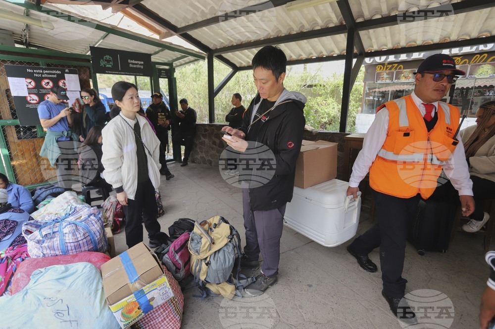 Tourists wait be evacuated from Ollantaytambo, Peru, due to a railway blockade, Tuesday, Sept. 16, 2025. (AP Photo/Milagros Saraya)