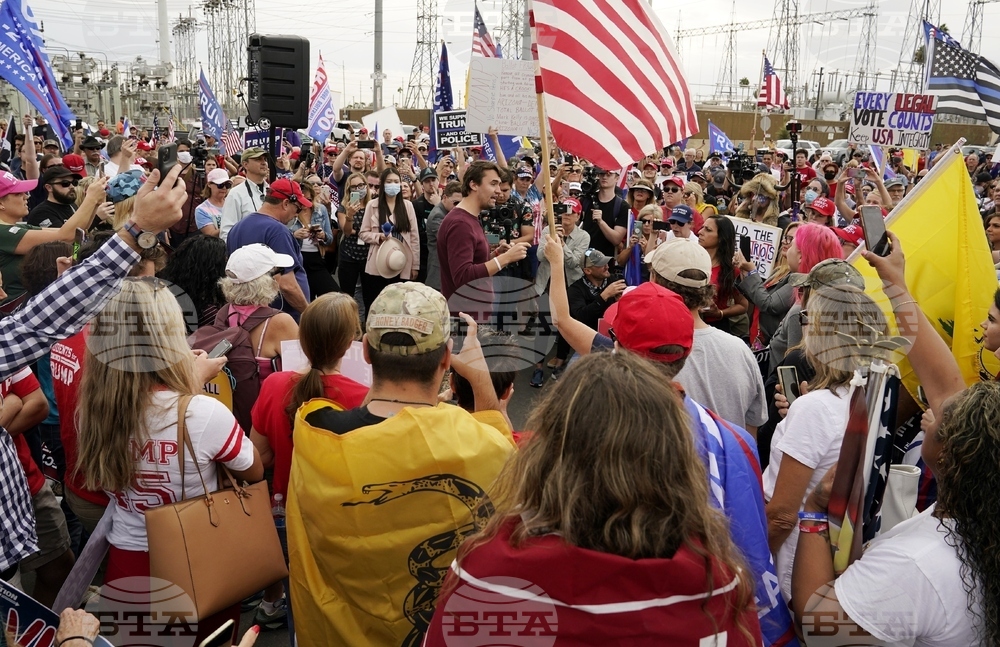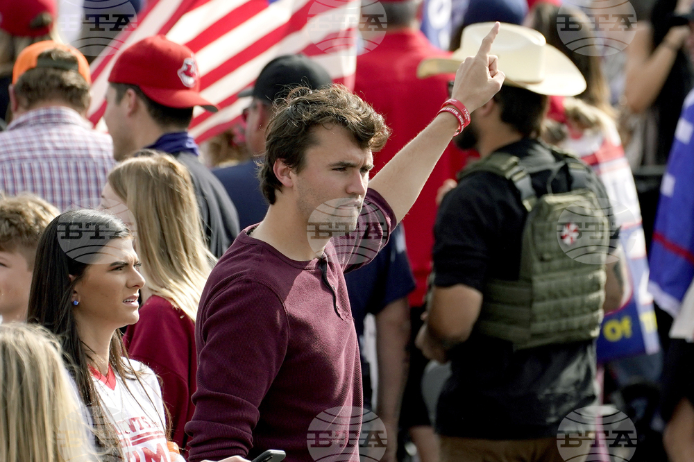 FILE - Charlie Kirk, center, conservative activist and founder of Turning Point USA, speaks to supporters of President Donald Trump at a rally, Nov. 6, 2020, in Phoenix. (AP Photo/Ross D. Franklin, File)