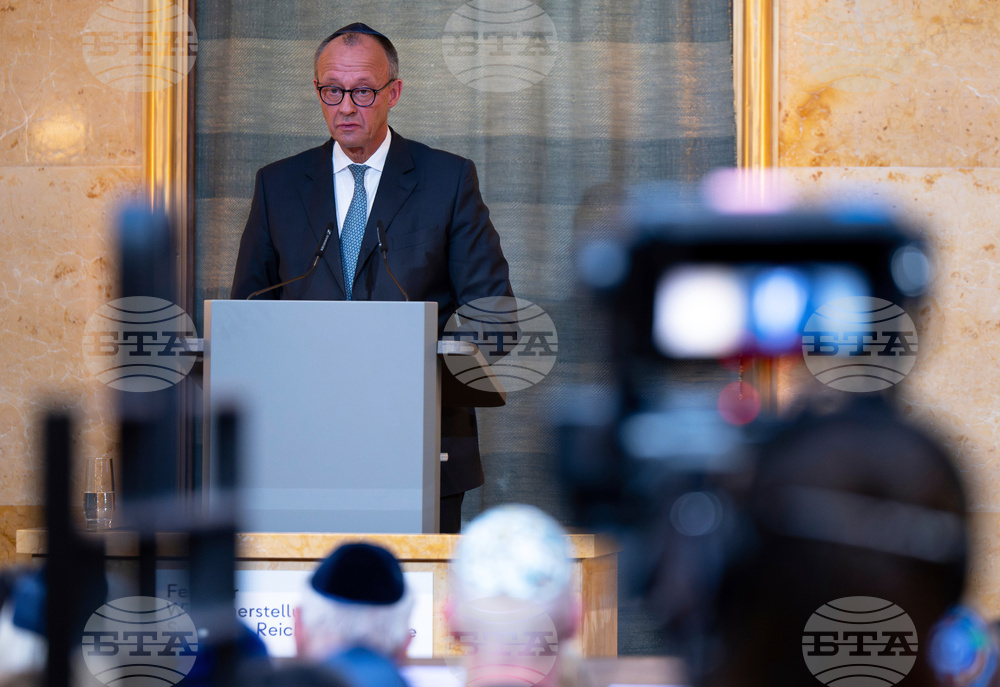 Germany's Federal Chancellor Friedrich Merz (CDU) takes part in a ceremony to mark the restoration of the Reichenbachstrasse synagogue, in Munich, Germany, Monday, Sept. 15, 2025. (Sven Hoppe/dpa via AP)
