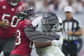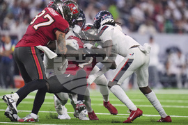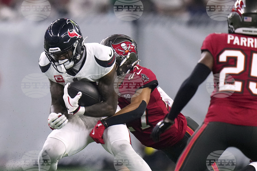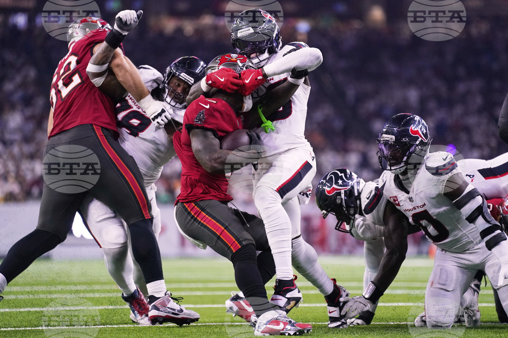 Houston Texans linebacker Christian Harris, grabs the helmet of Tampa Bay Buccaneers running back Bucky Irving (7) as Harris attempts to make a stop in the second half of an NFL football game Monday, Sept. 15, 2025, in Houston, Texas. (AP Photo/Eric Gay)