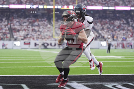 Tampa Bay Buccaneers wide receiver Ryan Miller (81) catches a touchdown pass as Houston Texans safety Calen Bullock (2) defends in the first half of an NFL football game Monday, Sept. 15, 2025, in Houston, Texas. (AP Photo/Eric Gay)