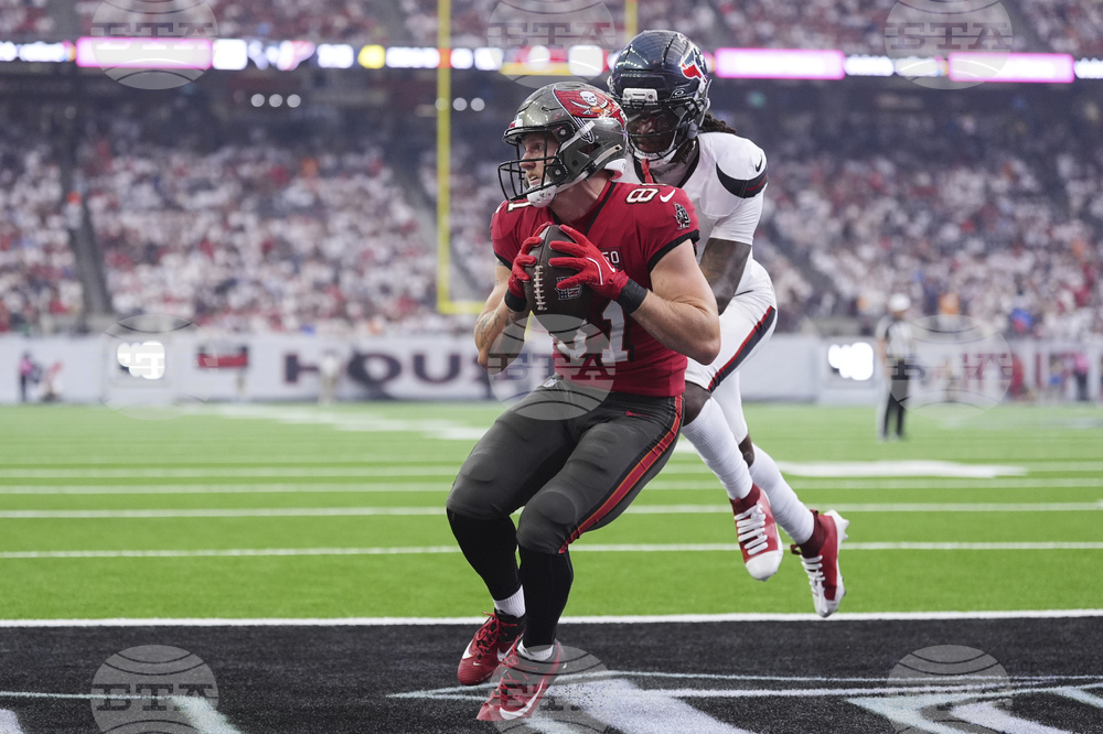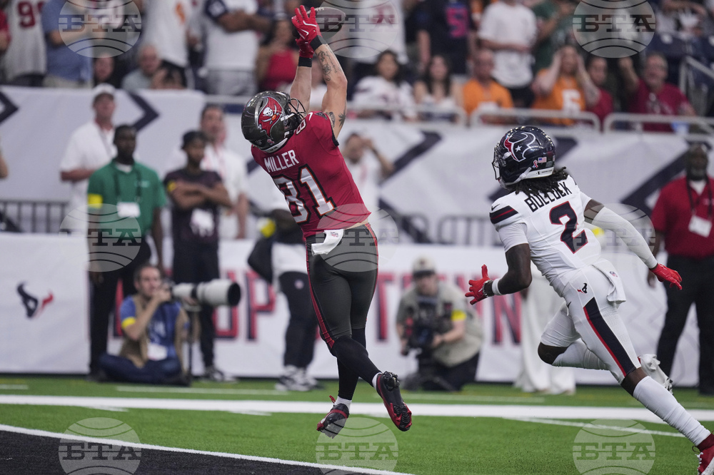 Tampa Bay Buccaneers wide receiver Ryan Miller (81) catches a touchdown pass in front of Houston Texans safety Calen Bullock (2) in the first half of an NFL football game Monday, Sept. 15, 2025, in Houston, Texas. (AP Photo/Eric Gay)
