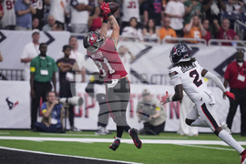 Tampa Bay Buccaneers wide receiver Emeka Egbuka (2) springs to the end zone to score a touchdown in the first half of an NFL football game against the Houston Texans Monday, Sept. 15, 2025, in Houston, Texas. (AP Photo/Eric Gay)