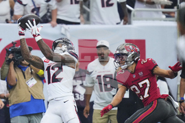 Houston Texans wide receiver Nico Collins (12) catches a touchdown pass as Tampa Bay Buccaneers cornerback Zyon McCollum (27) defends in the first half of an NFL football game Monday, Sept. 15, 2025, in Houston, Texas. (AP Photo/Eric Gay)