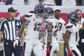 Houston Texans' Nick Chubb, second from left, celebrates his touchdown run with Nico Collins (12) and others in the second half of an NFL football game against the Tampa Bay Buccaneers Monday, Sept. 15, 2025, in Houston, Texas. (AP Photo/Eric Christian Smith)