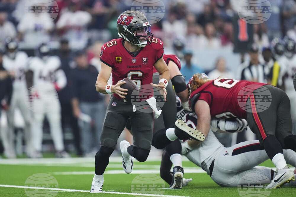 Tampa Bay Buccaneers quarterback Baker Mayfield (6) attempts to escape from pressure from the Houston Texans in the first half of an NFL football game Monday, Sept. 15, 2025, in Houston, Texas. (AP Photo/Eric Christian Smith)