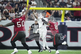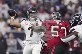 Houston Texans quarterback C.J. Stroud (7) throws a pass under pressure from Tampa Bay Buccaneers defensive tackle Vita Vea (50) in the first half of an NFL football game Monday, Sept. 15, 2025, in Houston, Texas. (AP Photo/Eric Christian Smith)