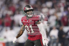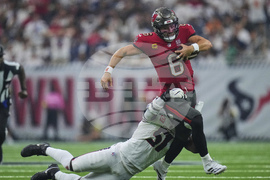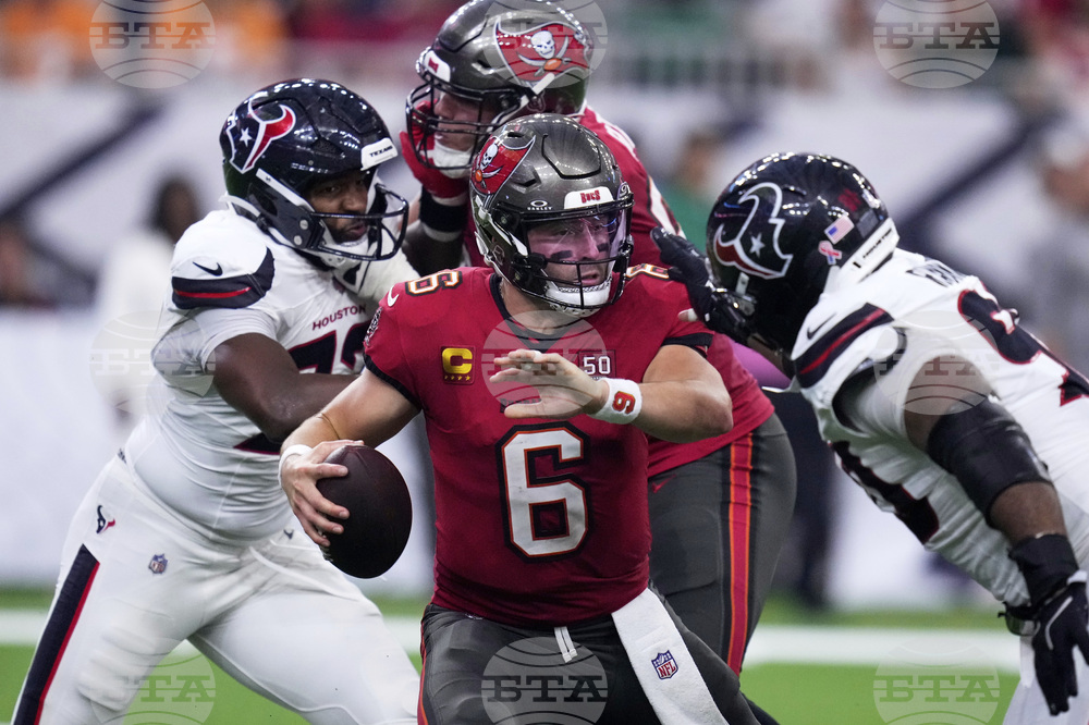 Tampa Bay Buccaneers quarterback Baker Mayfield (6) escapes pressure from Houston Texans defensive end Will Anderson Jr. (51) in the second half of an NFL football game Monday, Sept. 15, 2025, in Houston, Texas. (AP Photo/Eric Gay)