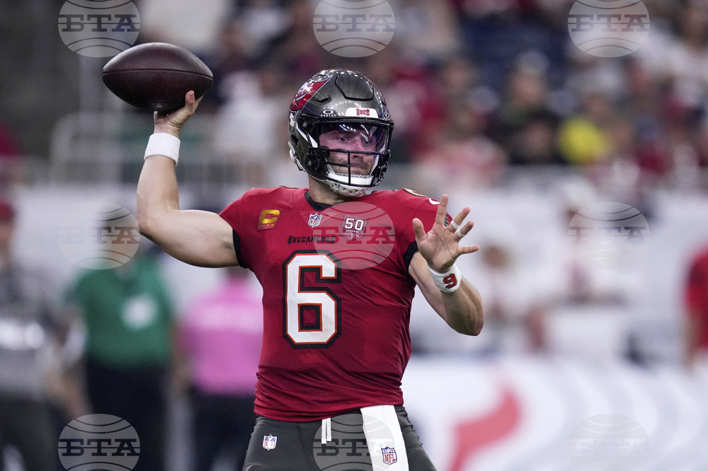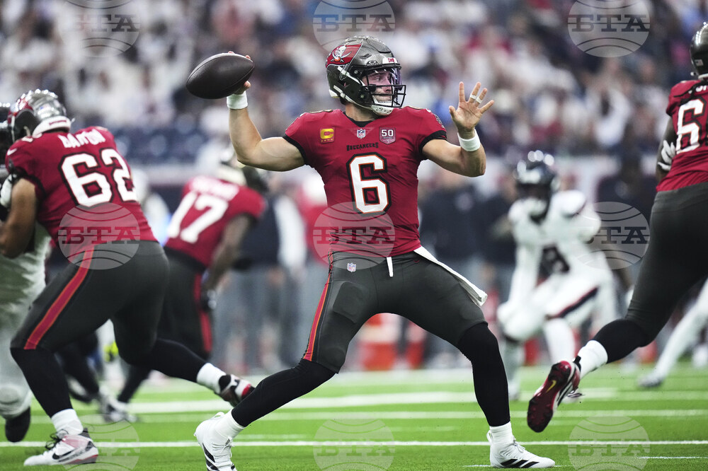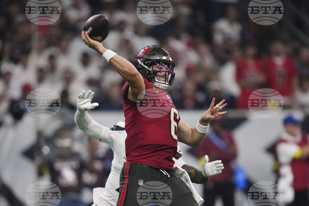 Tampa Bay Buccaneers quarterback Baker Mayfield throws a pass in the first half of an NFL football game against the Houston Texans Monday, Sept. 15, 2025, in Houston, Texas. (AP Photo/Eric Gay)