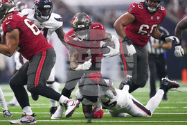 Tampa Bay Buccaneers running back Rachaad White, center bottom, scores a touchdown on a run as Houston Texans' C.J. Gardner-Johnson (8), Sheldon Rankins (90) and others look on in the second half of an NFL football game Monday, Sept. 15, 2025, in Houston, Texas. (AP Photo/Eric Christian Smith)