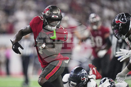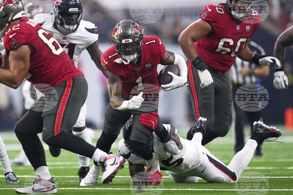 Tampa Bay Buccaneers running back Rachaad White (1) runs the ball in the first half of an NFL football game against the Houston Texans Monday, Sept. 15, 2025, in Houston, Texas. (AP Photo/Eric Gay)