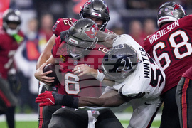 Tampa Bay Buccaneers quarterback Baker Mayfield (6) is sacked by Houston Texans defensive end Danielle Hunter (55) in the first half of an NFL football game Monday, Sept. 15, 2025, in Houston, Texas. (AP Photo/Eric Christian Smith)