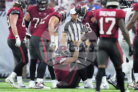 Tampa Bay Buccaneers quarterback Baker Mayfield is helped to his feet by Ben Bredeson (68) after Mayfield was sacked by the Houston Texans in the first half of an NFL football game Monday, Sept. 15, 2025, in Houston, Texas. (AP Photo/Eric Gay)
