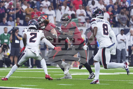 Tampa Bay Buccaneers wide receiver Emeka Egbuka (2) sprints to the end zone to score a touchdown as Houston Texans' Calen Bullock (2) and C.J. Gardner-Johnson (8) defend in the first half of an NFL football game Monday, Sept. 15, 2025, in Houston, Texas. (AP Photo/Eric Gay)