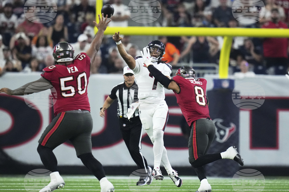 Houston Texans quarterback C.J. Stroud (7) throws a pass under pressure from Tampa Bay Buccaneers' Vita Vea (50) and SirVocea Dennis (8) in the first half of an NFL football game Monday, Sept. 15, 2025, in Houston, Texas. (AP Photo/Eric Gay)