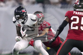 Houston Texans running back Nick Chubb (21) gains yards on a run as Tampa Bay Buccaneers safety Antoine Winfield Jr. (31) defends in the first half of an NFL football game Monday, Sept. 15, 2025, in Houston, Texas. (AP Photo/Eric Gay)