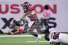 Tampa Bay Buccaneers quarterback Baker Mayfield (6) sprints out of the pocket under pressure from Houston Texans defensive tackle Sheldon Rankins (90) in the second half of an NFL football game Monday, Sept. 15, 2025, in Houston, Texas. (AP Photo/Eric Gay)