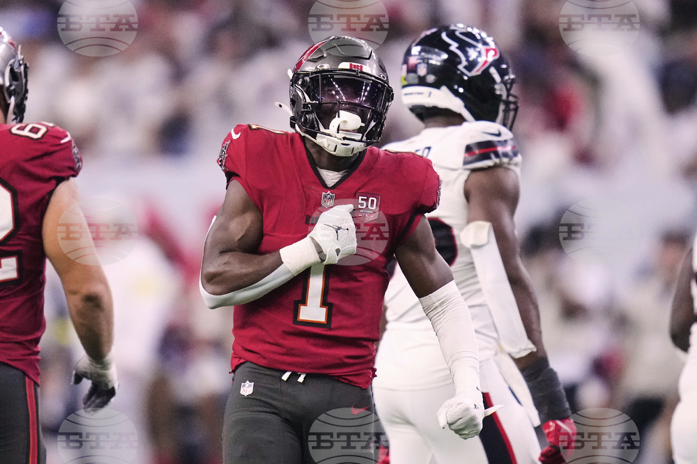 Tampa Bay Buccaneers safety Antoine Winfield Jr. celebrates a defensive stop against the Houston Texans late in the second half of an NFL football game Monday, Sept. 15, 2025, in Houston, Texas. (AP Photo/Eric Gay)