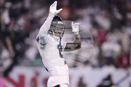 Houston Texans safety Jalen Pitre (5) celebrates a defensive stop against the Tampa Bay Buccaneers in the second half of an NFL football game Monday, Sept. 15, 2025, in Houston, Texas. (AP Photo/Eric Christian Smith)