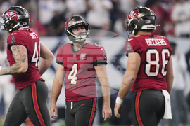 Tampa Bay Buccaneers' Baker Mayfield (6) jogs off the field after the first half of an NFL football game against the Houston Texans Monday, Sept. 15, 2025, in Houston, Texas. (AP Photo/Eric Gay)