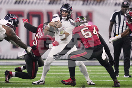 Houston Texans quarterback C.J. Stroud (7) attempts to escape pressure from Tampa Bay Buccaneers linebacker Haason Reddick (5) and Lavonte David (54) in the second half of an NFL football game Monday, Sept. 15, 2025, in Houston, Texas. (AP Photo/Eric Christian Smith)
