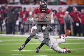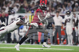 Tampa Bay Buccaneers wide receiver Mike Evans (13) attemtsp to escape a tackle by Houston Texans safety Calen Bullock (2) in the second half of an NFL football game Monday, Sept. 15, 2025, in Houston, Texas. (AP Photo/Eric Christian Smith)