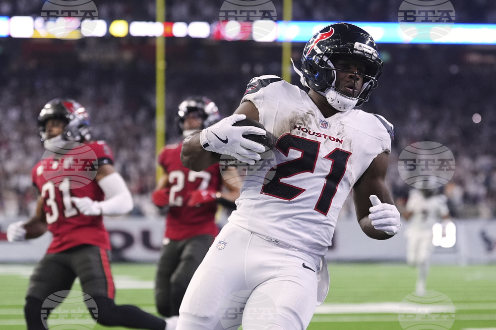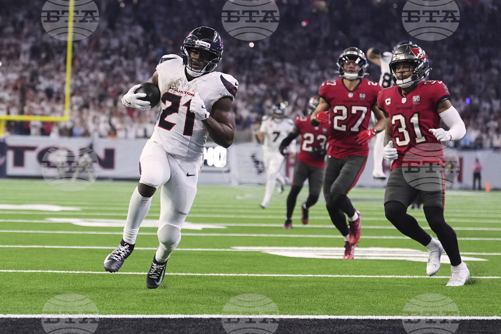 Houston Texans running back Nick Chubb (21) runs the ball for a touchdown as Tampa Bay Buccaneers' Antoine Winfield Jr. (31) and Zyon McCollum (27) give chase in the second half of an NFL football game Monday, Sept. 15, 2025, in Houston, Texas. (AP Photo/Eric Gay)