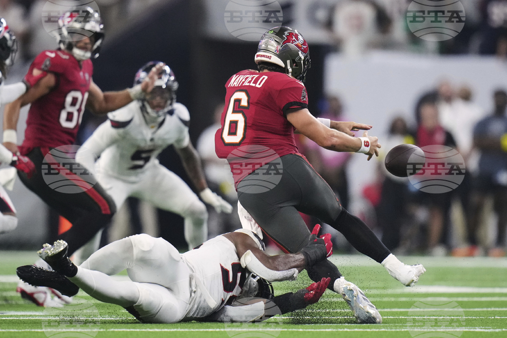 Tampa Bay Buccaneers quarterback Baker Mayfield (6) is stripped of the ball in the second half of an NFL football game against the Houston Texans Monday, Sept. 15, 2025, in Houston, Texas. (AP Photo/Eric Gay)