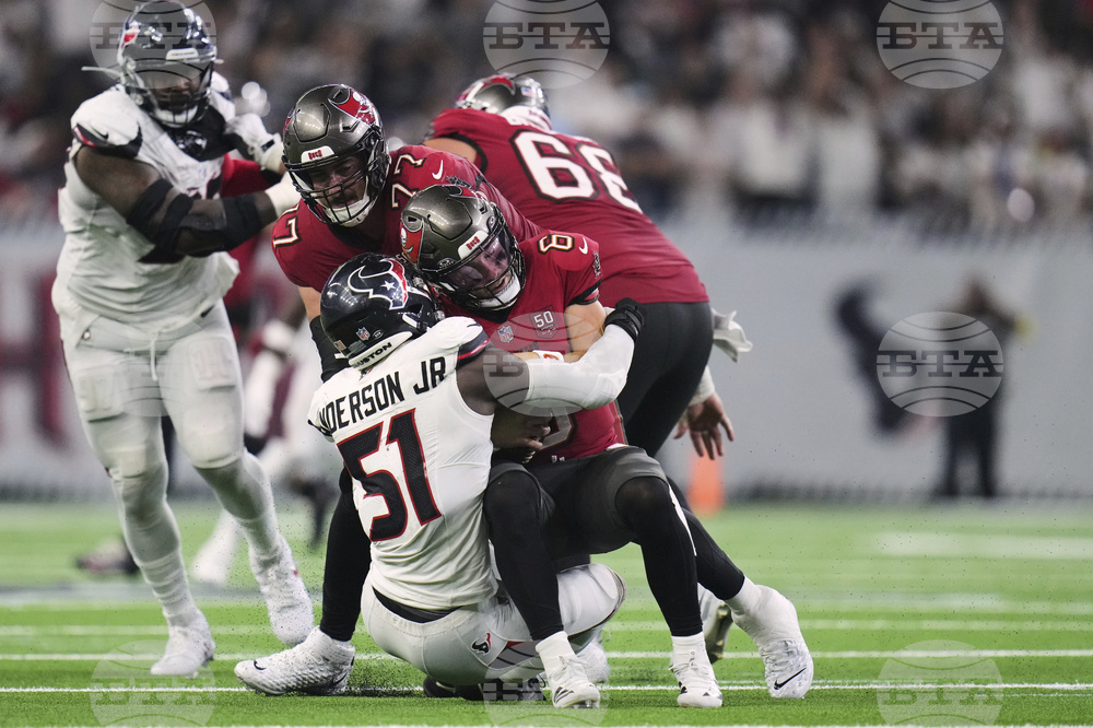 Houston Texans defensive end Will Anderson Jr. (51) sacks Tampa Bay Buccaneers quarterback Baker Mayfield (6) in the second half of an NFL football game Monday, Sept. 15, 2025, in Houston, Texas. (AP Photo/Eric Gay)