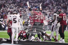 Tampa Bay Buccaneers offensive tackle Charlie Heck (77) celebrates a touchdown run by running back Rachaad White (1) as Houston Texans safety Jalen Pitre (5) and others look on in the second half of an NFL football game Monday, Sept. 15, 2025, in Houston, Texas. (AP Photo/Eric Gay)