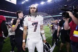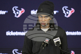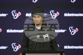 Houston Texans quarterback C.J. Stroud responds to questions during a news conference after the team's NFL football game against the Tampa Bay Buccaneers Monday, Sept. 15, 2025, in Houston, Texas. (AP Photo/Eric Gay)