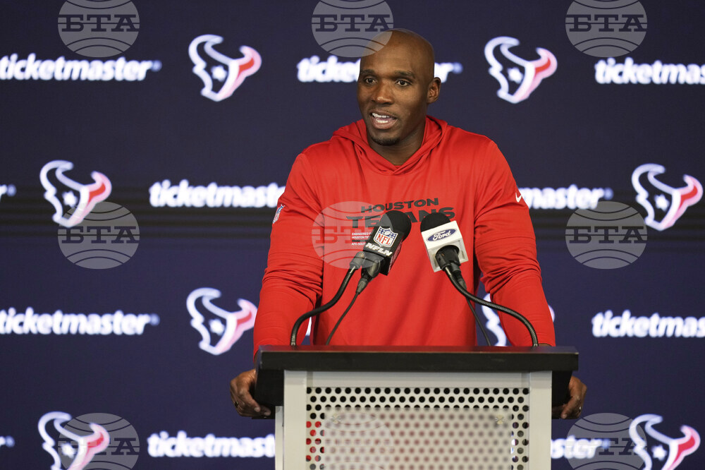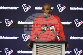 Houston Texans head coach DeMeco Ryans responds to questions during a news conference after the team's NFL football game against the Tampa Bay Buccaneers Monday, Sept. 15, 2025, in Houston, Texas. (AP Photo/Eric Christian Smith)