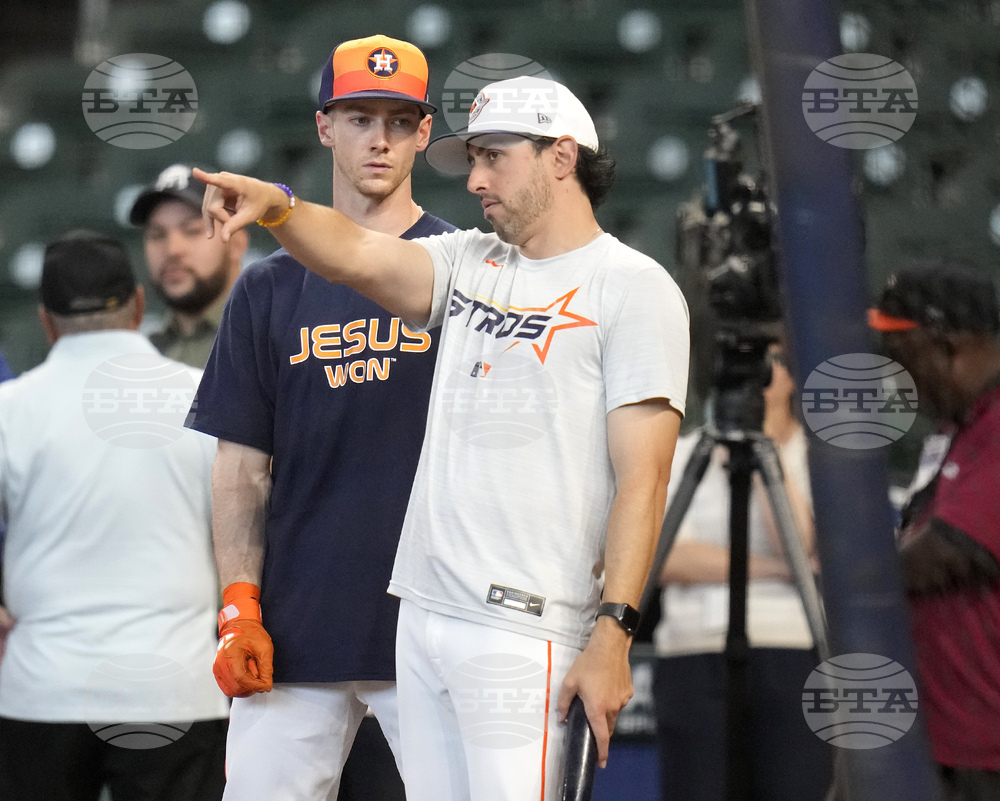 Houston Astros rookie Zachary Cole, left, gets pointers from quality assurance coach Jason Bell, right, during batting practice before a baseball game against the Texas Rangers, Monday, Sept. 15, 2025, in Houston. (AP Photo/Karen Warren)