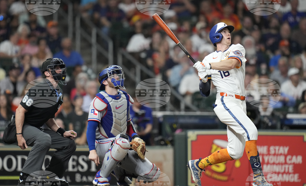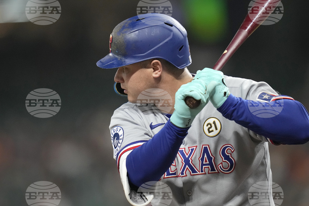 Texas Rangers' Joc Pederson wears a No. 21 patch for Roberto Clemente Day during his at-bat against Houston Astros starting pitcher Jason Alexander during the first inning of a baseball game Monday, Sept. 15, 2025, in Houston. (AP Photo/Karen Warren)