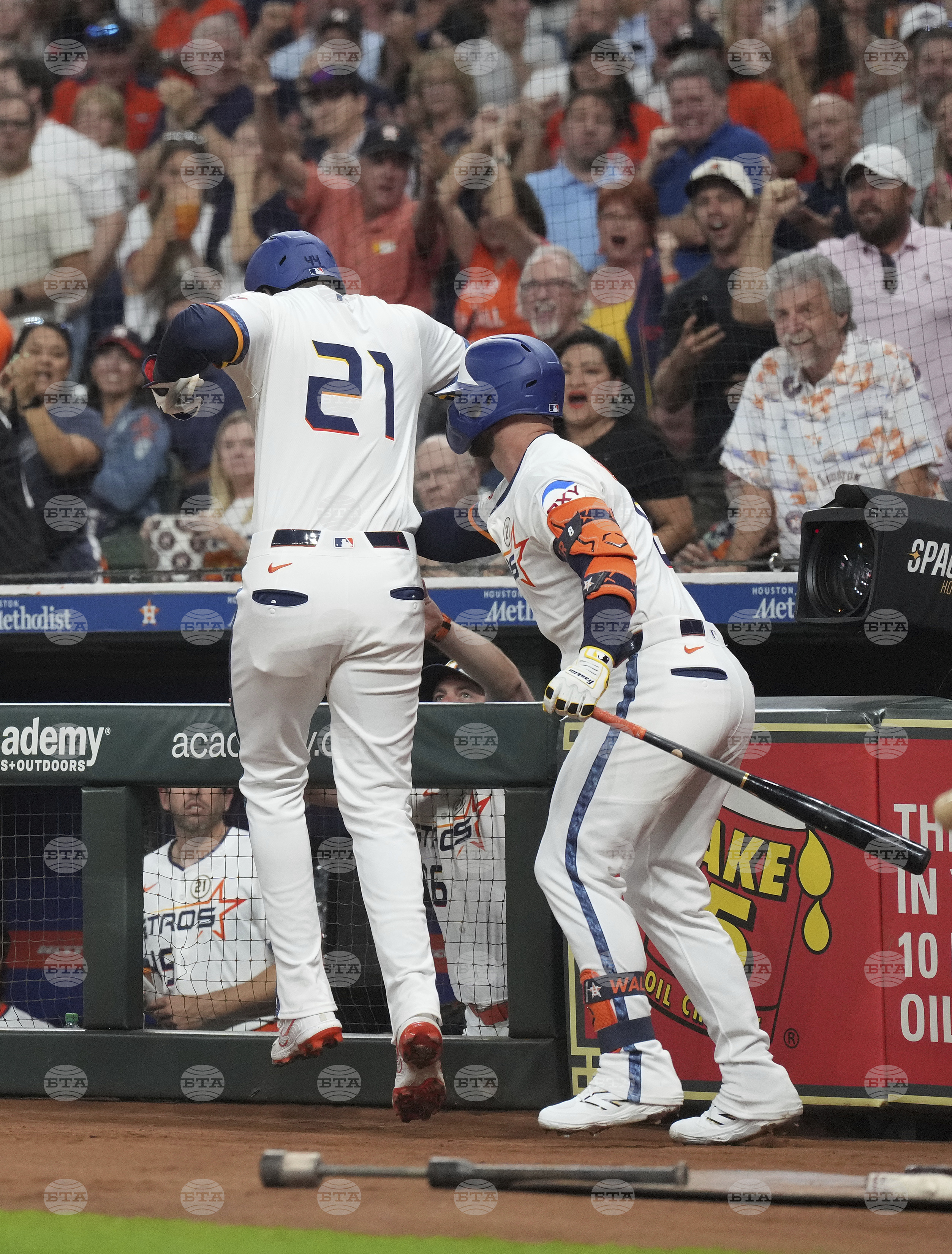 Houston Astros' Zachary Cole, right, celebrates with Jeremy Peña, left, after hitting two-run home run off Texas Rangers starting pitcher Jack Leiter during the fifth inning of a baseball game Monday, Sept. 15, 2025, in Houston. (AP Photo/Karen Warren)