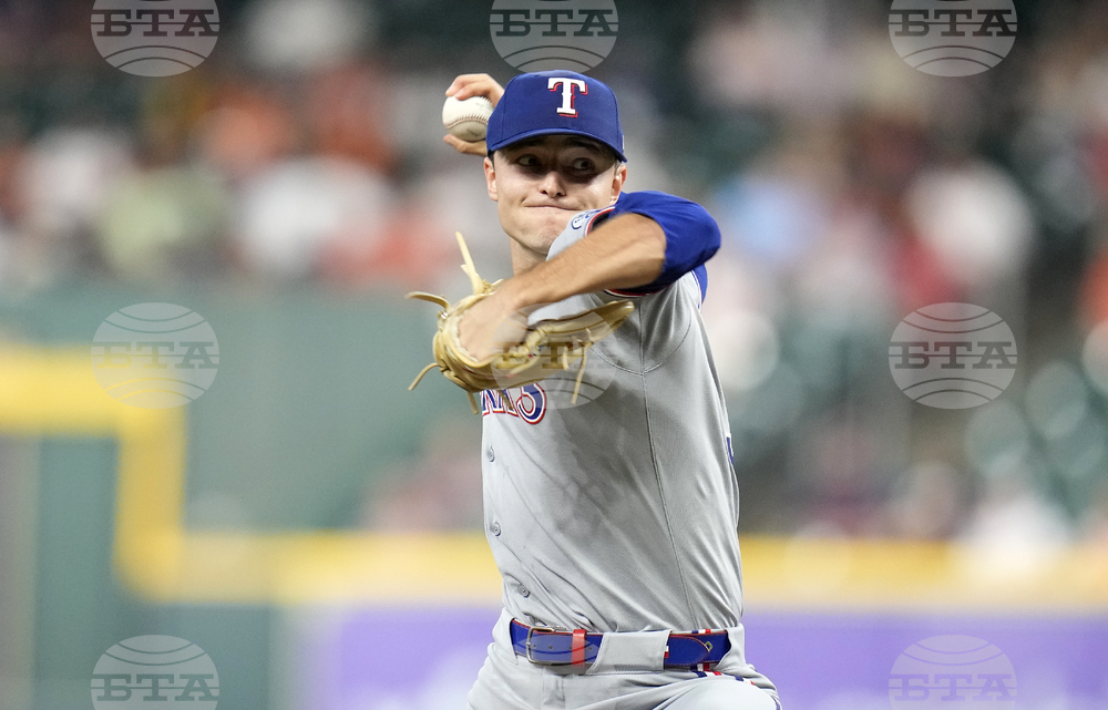 Texas Rangers starting pitcher Jack Leiter delivers to Houston Astros' Jeremy Peña during the first inning of a baseball game Monday, Sept. 15, 2025, in Houston. (AP Photo/Karen Warren)