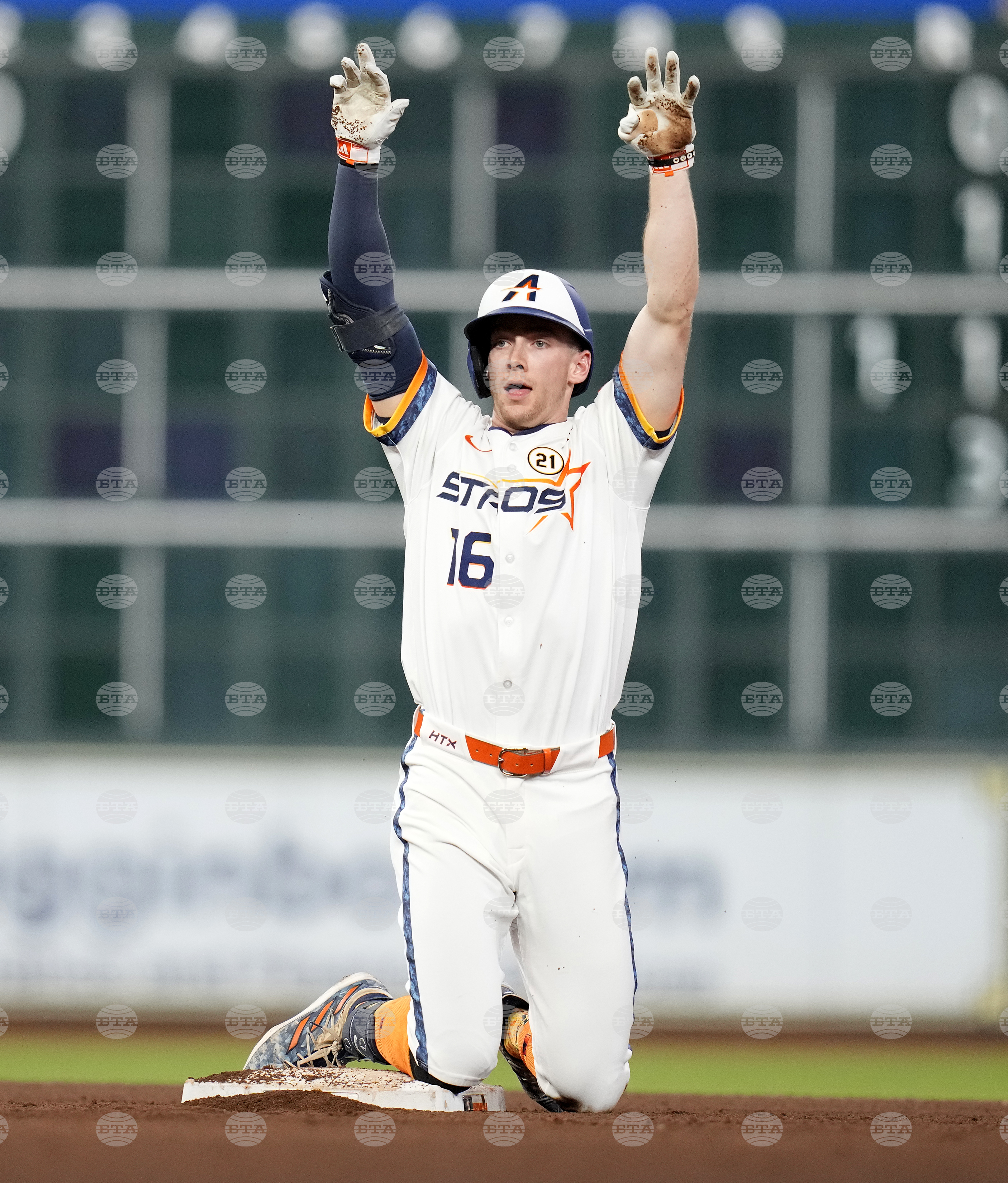 Houston Astros' Zachary Cole celebrates at second base after his RBI single off Texas Rangers relief pitcher Jacob Webb during the seventh inning of a baseball game Monday, Sept. 15, 2025, in Houston. (AP Photo/Karen Warren)