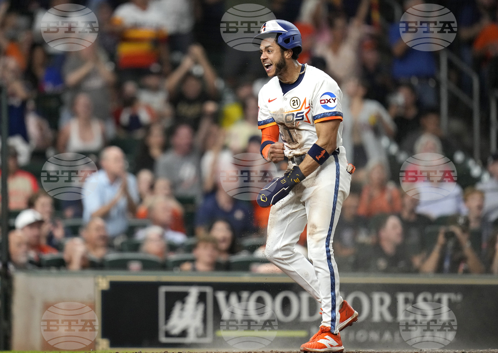 Houston Astros' Yordan Alvarez, front right, scores on an RBI single hit by Carlos Correa against the Texas Rangers during the first inning of a baseball game Monday, Sept. 15, 2025, in Houston. (AP Photo/Karen Warren)